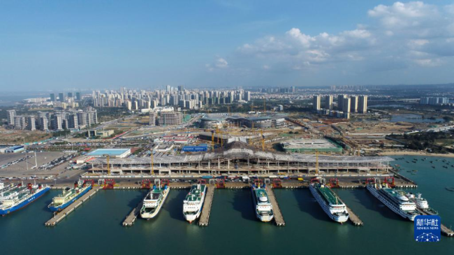 这是2022年2月11日拍摄的海口新海港客运综合枢纽项目施工现场(无人机照片)。新华社发(黎多江 摄)