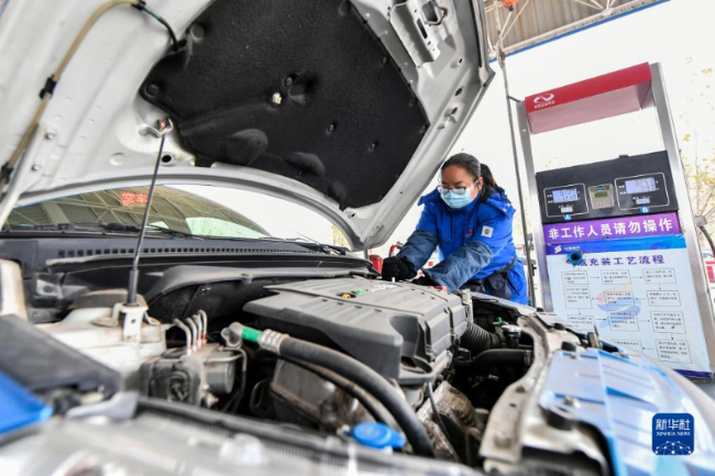 山西省晋城市泽北加气站工作人员在为汽车加煤层气(2020年12月9日摄)。新华社记者 曹阳 摄