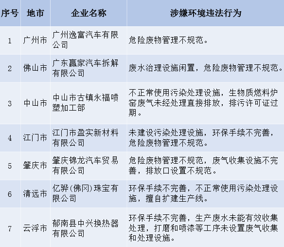 督查组在第十二批次检查中发现,部分企业环保意识薄弱,存在危险废物管理不规范、不正常使用污染处理设施等涉嫌环境违法行为。如广州逸富汽车有限公司危险废物管理不规范。位于佛山的广东赢家汽车拆解有限公司废水治理设施闲置,危险废物管理不规范。江门市盈实新材料有限公司未建设污染处理设施,环保手续不完善,危险废物管理不规范。肇庆锦龙汽车贸易有限公司危险废物管理不规范,废气收集设施不完善,排放口设置不规范。中山市古镇永福喷塑加工部不正常使用污染处理设施,生物质燃料炉窑废气未经处理直接排放,排污许可证过期。位于清远的亿骅(佛冈)珠宝有限公司环保手续不完善,不正常使用污染处理设施,擅自扩建生产线。