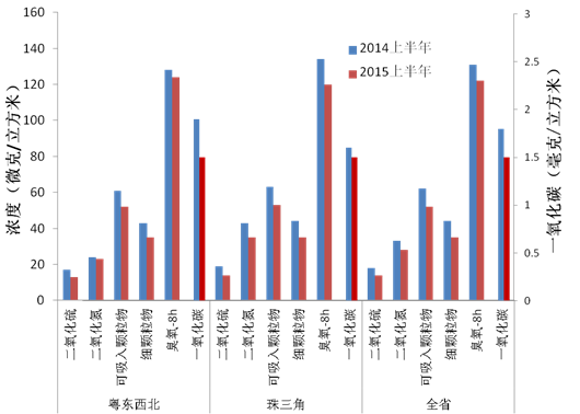 珠三角二氧化硫平均浓度为14微克/立方米,较去年同期下降26.3%;二氧化氮平均浓度为35微克/立方米,较去年同期下降18.6%;可吸入颗粒物平均浓度为53微克/立方米,较去年同期下降15.9%;细颗粒物平均浓度为35微克/立方米,较去年同期下降20.5%;臭氧日最大8小时均值第90百分位数浓度为120微克/立方米,较去年同期下降10.4%;一氧化碳均值第95百分位数浓度为1.5毫克/立方米,较去年同期下降6.3%。