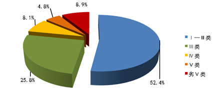 2015年上半年,全省主要江河水质总体良好,124个省控断面中,82.3%的断面水质达到水环境功能区水质标准,78.2%的断面水质优良(Ⅰ~Ⅲ类)。52.4%的断面为Ⅰ~Ⅱ类,水质优,25.8%的断面为Ⅲ类,水质良好,8.1%的断面为Ⅳ类,水质属轻度污染,4.8%的断面为Ⅴ类,水质属中度污染,8.9%的断面为劣Ⅴ类,水质属重度污染。