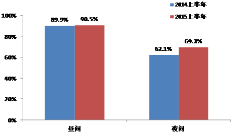 2015年上半年,各类功能区噪声监测点次达标率分别是:0类区昼间100%,夜间100%1类区昼间83.1%,夜间60.6%2类区昼间88.6%,夜间78.6%3类区昼间100%,夜间92.5%4a类区昼间90.4%,夜间40.4%;4b类区昼间100%,夜间100%