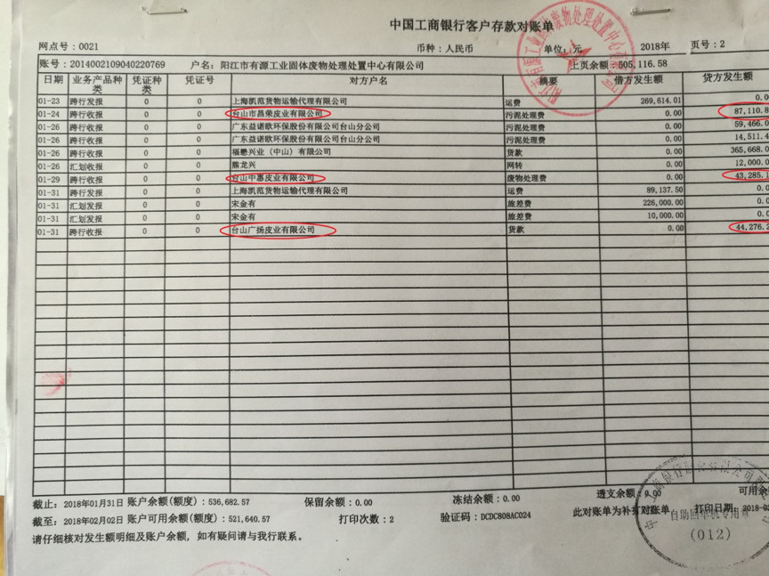 图2 有源公司接收皮革企业污泥处理费银行流水