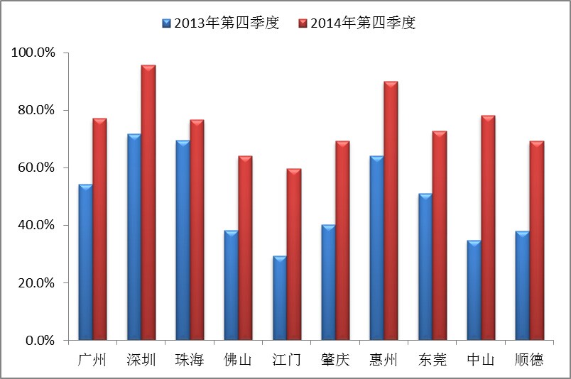 3  2014年第四季度珠三角城市空气质量达标天数比例同比