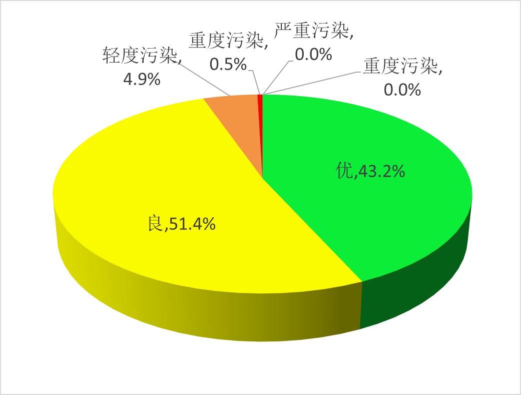 2016年第一季度全省各城市空气质量达标天数比例平均为94.7%,其中,优占43.2%,良占51.4%;超标天数比例为5.4%,其中轻度污染占4.9%,中度污染占0.5%,无重度污染与严重污染。