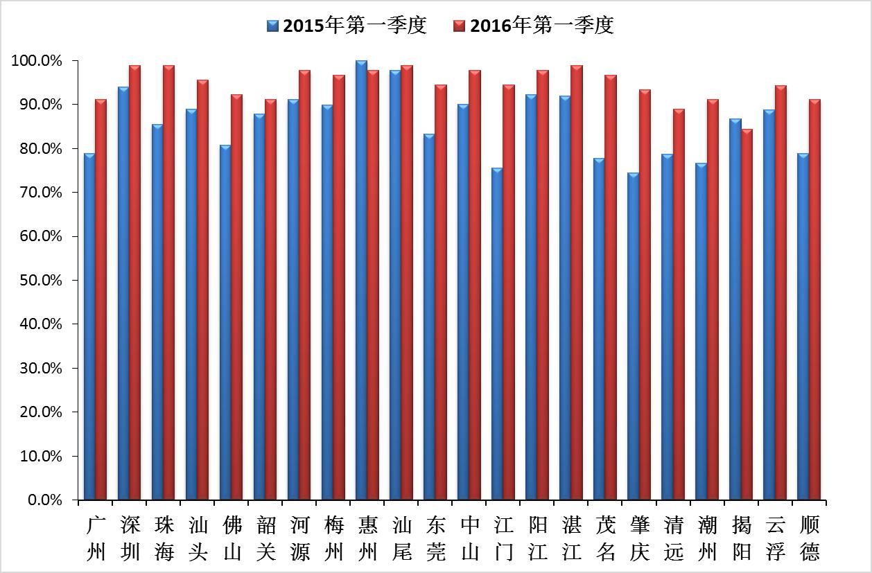 2016年第一季度与去年同期相比,全省城市空气质量达标天数比例平均为94.7%,较去年同期上升8.9个百分点。珠三角城市空气质量达标天数比例平均为95.1%,较去年同期上升11.1个百分点。