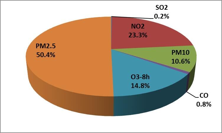 2016年第一季度全省城市主要空气污染物为细颗粒物(PM2.5),其作为每日首要污染物的比例为50.4%,其次为二氧化氮(NO2),占比为23.3%,臭氧日最大8小时均值(O3-8h)和可吸入颗粒物(PM10)作为首要污染物的比例分别为14.8%和10.6%。珠三角地区NO2作为首要污染物的比例为41.5%,PM2.5、O3-8h和 PM10作为首要污染物的比例分别为34.6%、12.9%和11.0%。珠三角以外地区PM2.5作为首要污染物的比例为66.1%,O3-8h 和PM10作为首要污染物的比例分别为16.6%和10.3%。