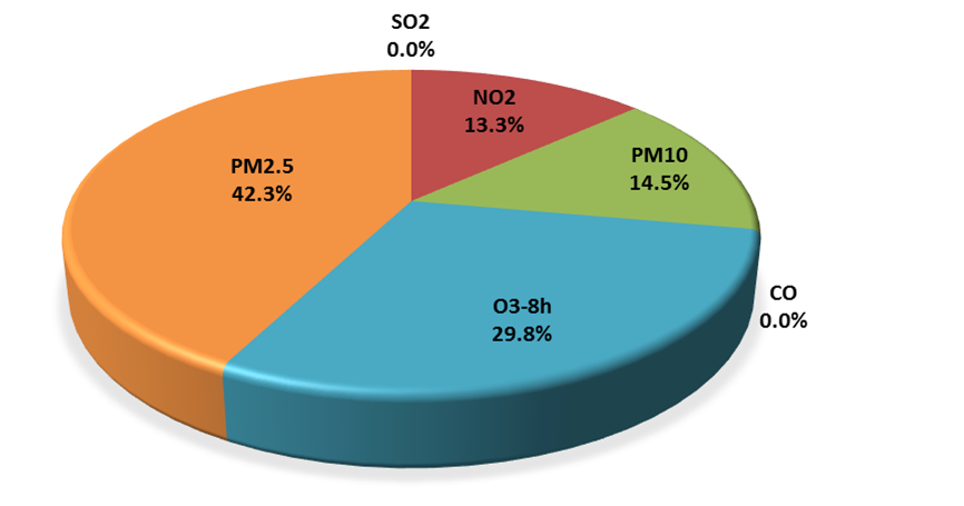 2016年第四季度全省城市主要空气污染物为细颗粒物(PM2.5),其作为每日首要污染物的比例为42.3%,其次为臭氧日最大8小时均值(O3-8h),占比为29.8%,可吸入颗粒物(PM10)和二氧化氮(NO2)作为首要污染物的比例分别为14.5%和13.3%。珠三角地区PM2.5作为首要污染物的比例为36.2%,O3-8h、NO2和PM10作为首要污染物的比例分别为28.2%、25.9%和9.7%。珠三角以外地区PM2.5作为首要污染物的比例为47.5%,O3-8h、PM10和NO2作为首要污染物的比例分别为31.2%、18.6%和2.8%。
