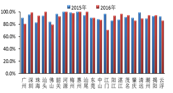 2016年第四季度与去年同期相比,全省城市空气质量达标天数比例平均为91.7%,较去年同期下降0.6个百分点。珠三角城市空气质量达标天数比例平均为87.3%,较去年同期下降3.5个百分点。