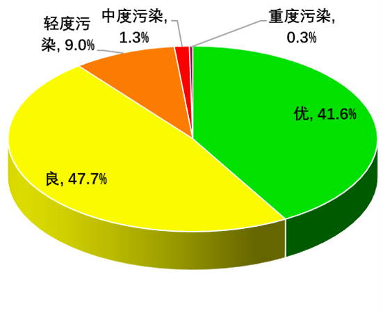 2017年全省各城市空气质量达标天数比例平均为89.4%,其中,优占41.6%,良占47.7%;超标天数比例为10.6%,其中轻度污染占9.0%,中度污染占1.3%,重度污染占0.3%,无严重污染。