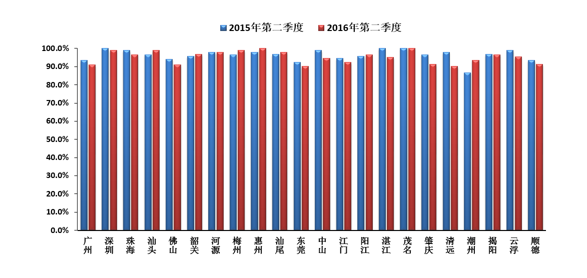2016年第二季度与去年同期相比,全省城市空气质量达标天数比例平均为95.2%,较去年同期下降1.1个百分点。珠三角城市空气质量达标天数比例平均为93.7%,较去年同期下降2.3个百分点。