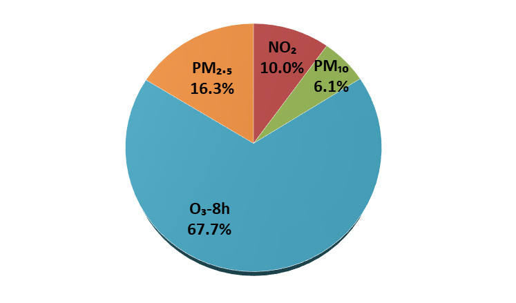 2018年3月全省城市主要空气污染物为臭氧日最大8小时均值(O3-8h),其作为每日首要污染物的比例为67.7%,其次为细颗粒物(PM2.5), 占比为16.3%,二氧化氮(NO2)和可吸入颗粒物(PM10)作为首要污染物的比例分别为10.0%和6.1%。珠三角地区O3-8h作为首要污染物的比例为64.9%,其次为NO2(占21.8%),PM2.5和PM10作为首要污染物的比例分别8.1%和5.2%。