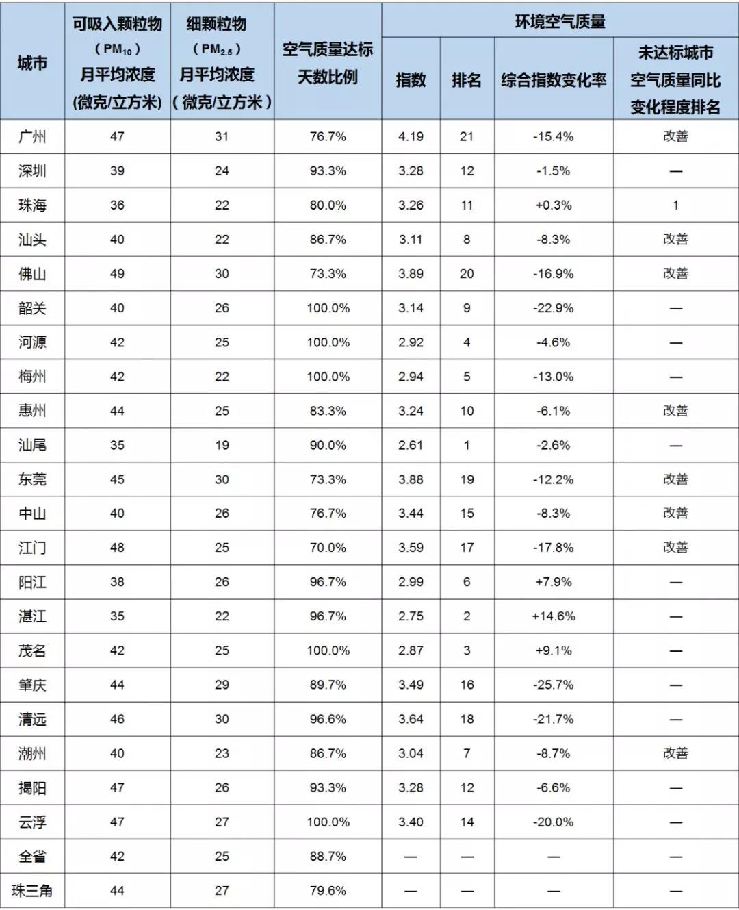 2018年9月,全省优良天数比例(AQI达标率)为88.7%,较2017年同期上升6.5个百分点;珠三角地区AQI达标率为79.6%,较2017年同期上升8.9个百分点。全省细颗粒物(PM2.5)平均浓度为25微克/立方米,较2017年同期下降13.8%;珠三角地区PM2.5平均浓度为27微克/立方米,较2017年同期下降10.0%。臭氧作为全省首要污染物的比例为91.6%。按照空气质量综合指数排名,前三位为汕尾、湛江和茂名市,后三位为广州、佛山和东莞市;与2017年同期相比,肇庆、韶关和清远等17市环境空气质量有所改善,湛江、茂名、阳江和珠海4市有所变差。