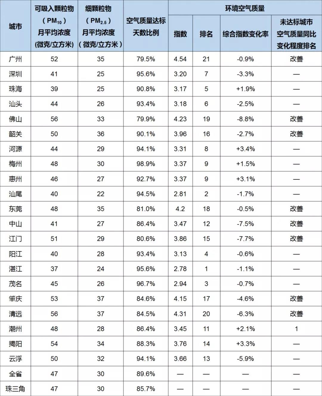 备注:1、城市各项污染物浓度在排名时段达到环境空气质量二级标准的,不参与城市空气质量变化程度排名;2、综合指数变化率单位为百分比,“+”表示空气质量变差,“-”表示空气质量改善。