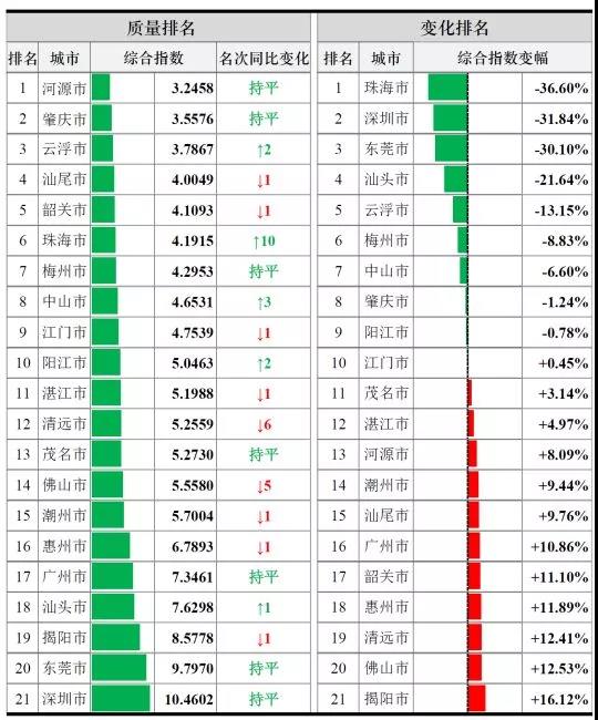 按照地表水省考断面综合指数排名,前三位为河源、肇庆、云浮市,后三位为深圳、东莞、揭阳市,与2017年同期相比,珠海、深圳、东莞等9市水环境质量有所改善,揭阳、佛山、清远等12市有所变差。